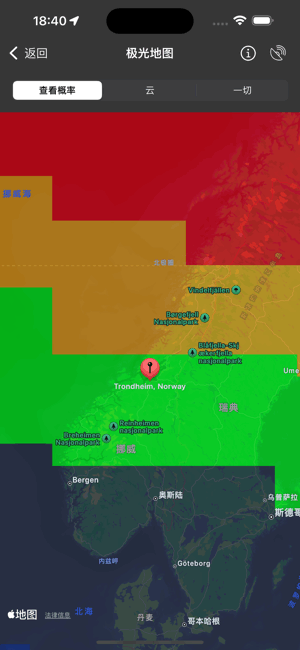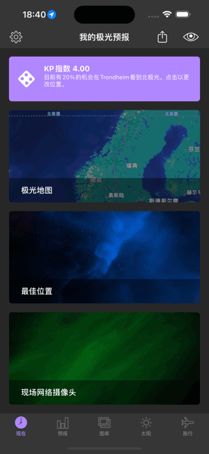 我的极光预报是观看北极光的最佳应用。它采用时尚的深色设计,为您提供您想知道的内容,对游客和严肃的极光观察者都有助益 -- 例如您看到北极光的可能性,或关于太阳风的详情和高分辨率太阳影像。利用这个应用程序,您可以很快看到北极光。