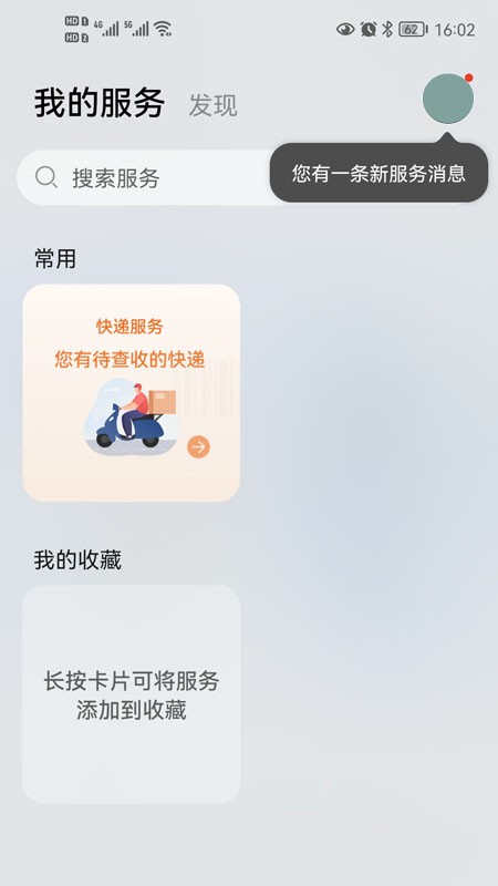 进入服务中心 > 发现,点击服务卡片,可按界面提示进行添加操作;长按服务卡片,可点击进入服务,一键直达相应的服务。