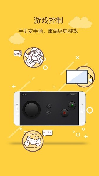 手机化身游戏手柄,玩游戏更加得心应手,现支持任天堂FC/红白机游戏、fc游戏、如超级玛丽、摩托、炸弹人,双截龙,冒险岛,热血足球,三目童子,雪人兄弟,马戏团,激龟快打,影子传说等经典游戏,也支持神庙逃亡、切水果等体感热门游戏,后将支持更多更好玩的游戏