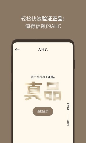 3.如认证为正品,跳转到结果页面,并显示结果为AHC正品; 如认证为非正品,则显示结果为仿造品。