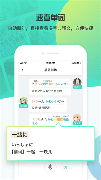 台词全篇断句,清晰区分语法词尾和假名词汇。多字典释义,从教材到权威词典,点击即查,方便快捷。