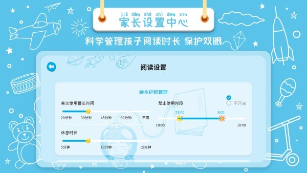 另外,app还能管理孩子的阅读时间,设置使用时长限制,超时后会自动进入休息模式,保护孩子的眼睛。作为家长,真的太方便了!