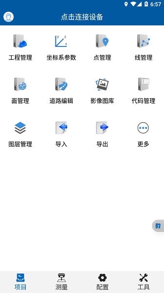 测放王手机版是针对工程行业提供测量放样的应用工具,具备丰富强大的功能,一键连接设备使用,轻松测量绘图、点放样,测量面积、河道,完成工程管理、道路编辑、代码管理、图层管理等项目任务,还提供各种计算、角度转换、校正等工具使用!