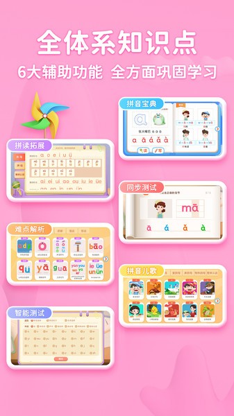 4、拼读巩固、拼音宝典、智能测试、同步测试、重点解析,5大辅助功能。全方位提升知识维度,轻松检测学习效果。