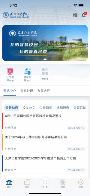 最新动态、校发公文、仁爱新闻、通知公告、会议活动等资讯推送