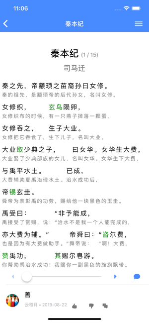 “读典籍”是一款专注于古典文献阅读的软件,内置了大量历史、科技、哲学等领域的经典书籍,比如《史记》《资治通鉴》《天工开物》等等,资源丰富且无需广告打扰。它最大的特点是可以按句进行文白对照,方便读者理解原文并讨论翻译准确性,这种设计对古籍爱好者来说特别友好。软件还支持离线阅读、字体调节、夜间模式等功能,操作简单又贴心。我个人觉得这个工具非常适合用来学习古典文献,尤其是对历史和传统文化感兴趣的朋友,完全不像是在用冷冰冰的电子书,更像是捧着一本真实的古籍慢慢品味。