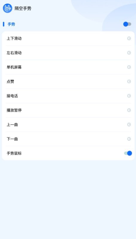 隔空手势手机版是一款提供手势操作控屏的应用工具,拥有着简约清晰的界面设计,操作便捷,一个手势就可以控制,包括隔空滑屏、点赞、接电话等,可以用来执行不同的桌面显示指令,让你轻松玩转手机,感兴趣的伙伴快来体验一番吧!