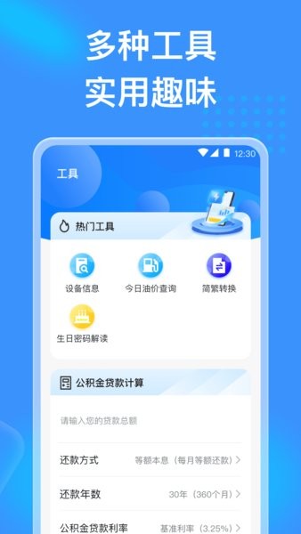 【生活工具】还有各种便民工具供您使用:查询油价、公积金贷款计算、生日密码解读以及文字简繁转换,增添生活便利性