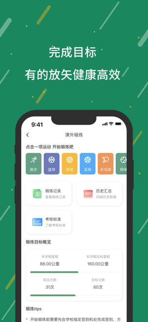 -- 支持跑步、篮球、足球、排球、网球等运动项目,实时记录锻炼历史,提供考核标准要求