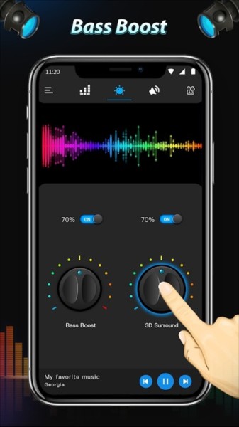-- 由音量增益滑块,低音增强器,虚拟3D环绕音和五个波段均衡器等组成。使用耳机以获得最佳的音效效果