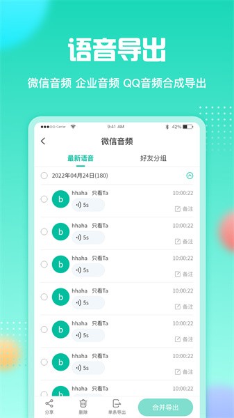 不只是微信,还支持QQ语音合并导出,QQ语音合并转发,QQ语音一键导出,QQ图片提取导出,语音整理导出,可以按日期或者按好友进行分类整理,还可以分享给好友,方便快捷。