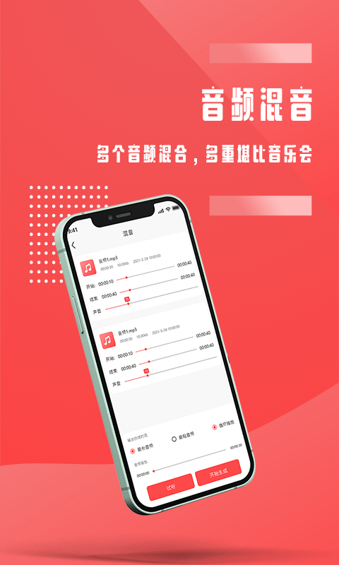 音频混音:支持两个音频进行混合操作,支持单个音量、音频时长调节