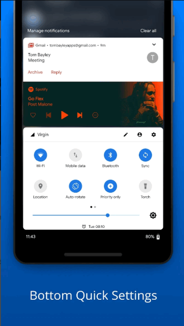 Bottom Quick Settings 是一个可以在屏幕底部打开快速设置面板的 Android 应用,包括 Wi-Fi 开关、数据流量、蓝牙、屏幕旋转、手电等功能,与 iOS 的底部设置抽屉类似。