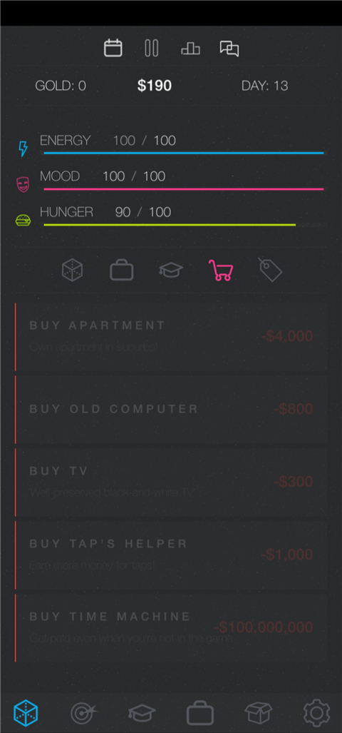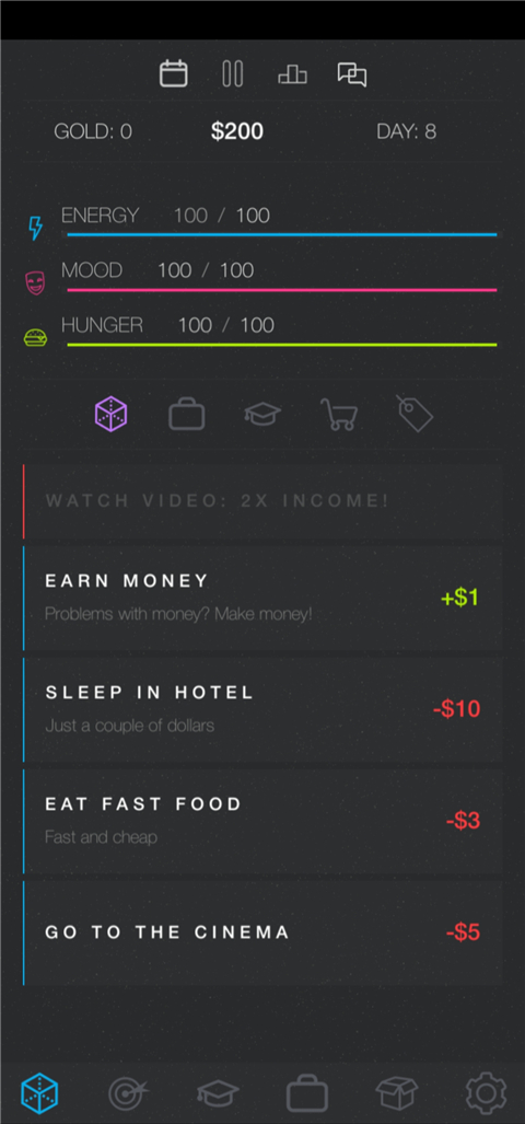 我觉得这个游戏挺有意思的,因为它让我看到人生的可能性。虽然游戏里的设定有点夸张,比如一夜成名、躺着赚钱,但这也反映了努力和机遇的重要性。游戏里的饥饿值、情感值和体力值提醒我们,生活需要平衡各种因素,不能只顾工作或享乐。