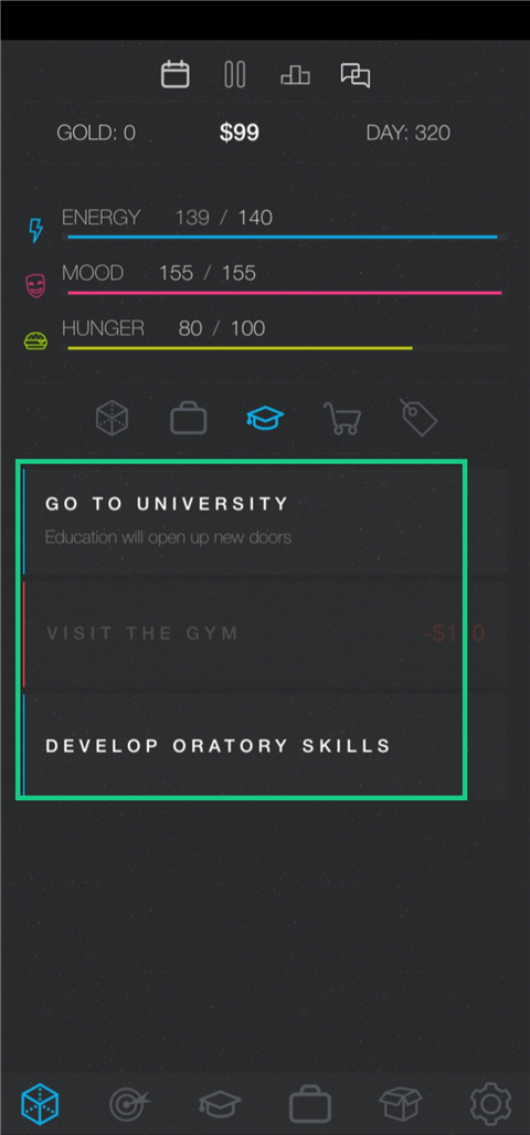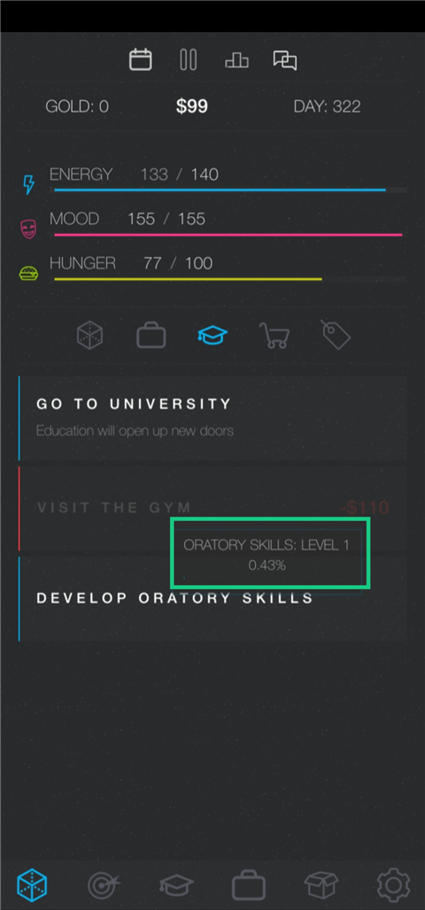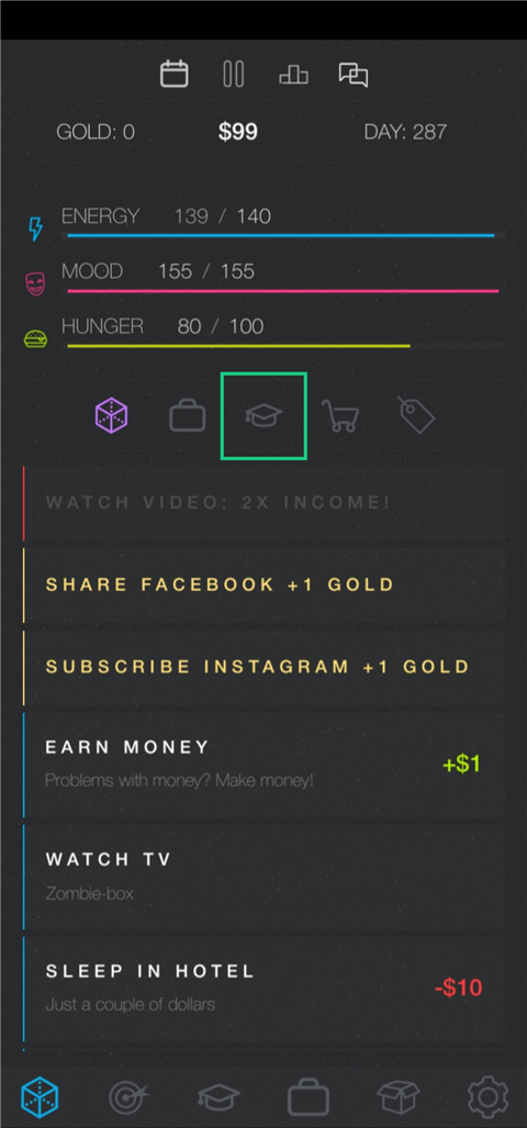 《生活模拟器2》是一款有趣的游戏,玩家可以体验从底层开始的生活,学习如何管理体力、心情和饥饿值,通过打工赚钱,逐步实现职业晋升和财富积累。游戏里还有技能提升系统,点击学士帽图标就能学习新技能,一开始是level1,后续还能继续进阶。