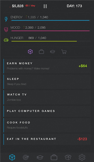 2、然后你有饥饿值,情感值,还有体力值去工作,你可以做你任何想做的事;