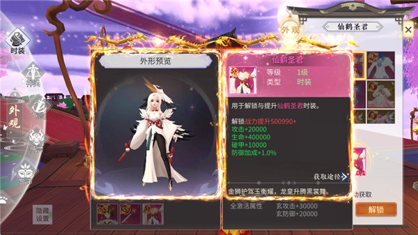 玩家解锁一套时装可飞速增强战斗力,还可提升攻击、生命、破甲等属性。