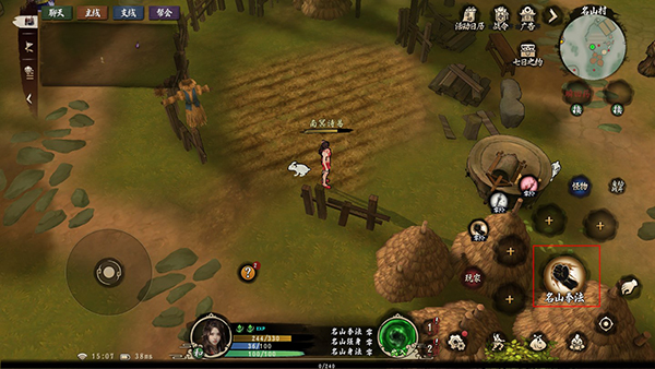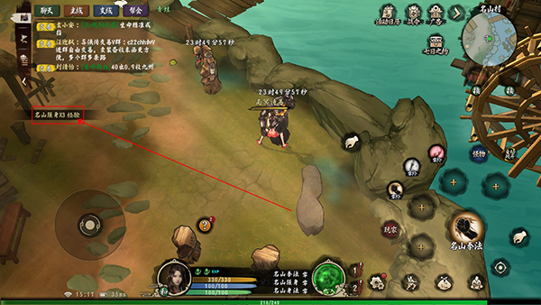 2、装备包裹里的斧子(使用名山双兵),直接跑到名山村内最下面的一个小黑屋(练功房)选择2小时免费的木桩,然后开始砍那个木桩(预计15-20分钟满级) (也可跳过练功房直接开始用名山双兵正常接主页面左侧任务进行开局)(主支线均可)