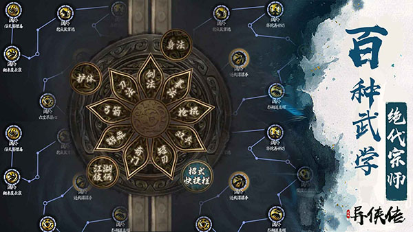 1、武学系统包含武功(平A),内功(技能),护体,身法(移速),和辅助技能(范围伤害及弱控制技能)
