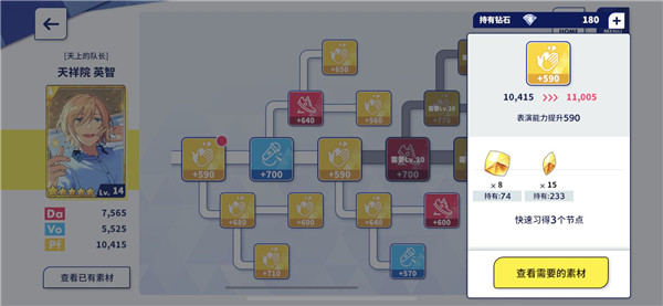 >>偶像之路:使用对应的道具或者钻石解锁格子,提高卡片的数值、技能、服装、才能绽放等。