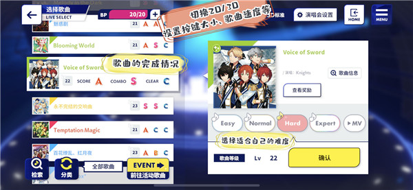 >>难度调整:每首歌曲拥有Easy、Normal、Hard、Expert四种难度及MV模式。越往后难度越高。