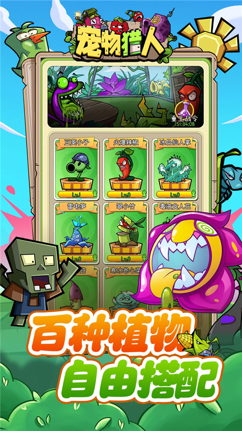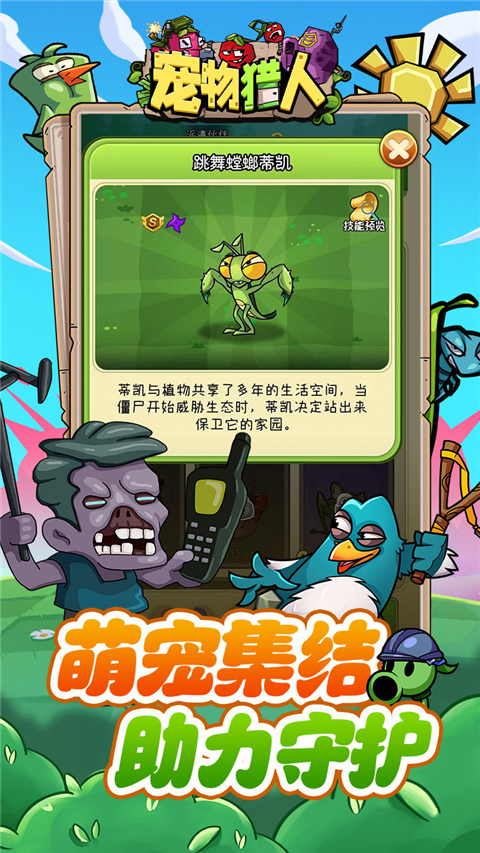 宠物猎人是一款魔性肉鸽塔防游戏,以植物大战僵尸为主题,玩家将通过升级植物抵抗僵尸,保卫花园。游戏中,玩家需要在花园前种植各种拥有强大技能的植物,如可以发射火焰的火爆辣椒、喷吐冰刺的冰晶仙人掌等,且植物在击打僵尸时,还会产生阳光,玩家可收集用于植物升级。宠物猎人游戏中各个植物都有多个强化进化方向,不仅可以增强攻击范围,还可以增加攻击力。宇宙射线袭来,花园就交给你了!