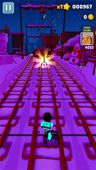 2、跑酷场景设定在圣诞节版本,制作效果非常不错,玩家可以在粉紫色的轨道上展开跑酷;