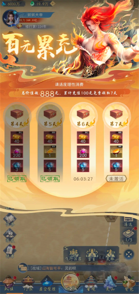 福利:送一个明道香(每天多一次注入次数),百元累充礼包(很多资源,加快升星和开图速度),送一个大道之力道果(大道之力影响开图),一个加快飞船探索的道具。