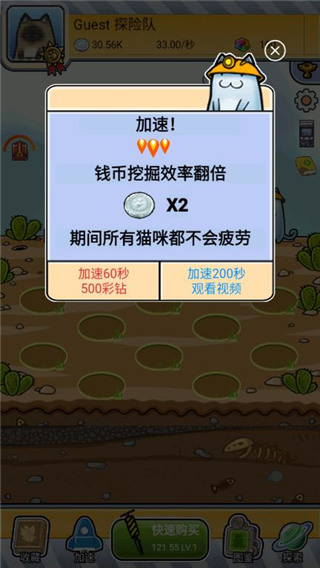 4、点击按钮旁边的加速,可以将挖掘效率进行翻倍,期间所有的猫咪都不会疲劳。