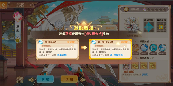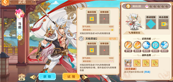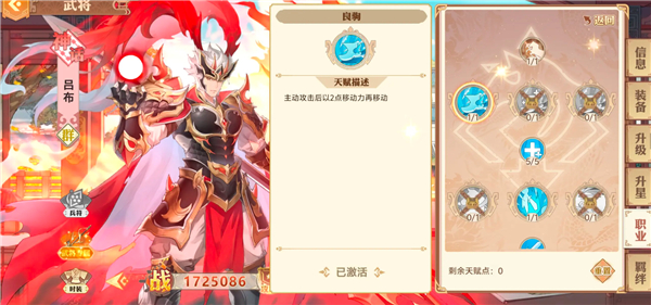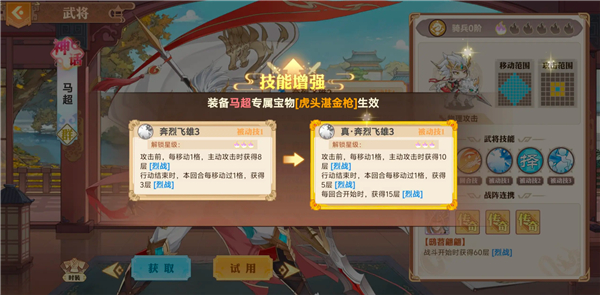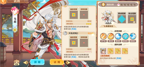 被动烈战:这个是马超能打伤害的核心,满100层后可以在当前回合继续出手一次,如果想玩好马超天赋必须选良驹,这点是保证马超在一次攻击后能够继续位移继续输出的核心。
