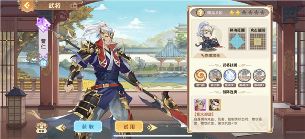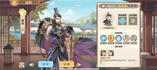 曹老板,曹老板在这套阵容上属于辅助的存在,首先曹操拥有一个强势的辅助进那个那就是回合技必眩晕目标,这个技能的存在让曹老板成为辅助界的大佬,当然曹老板不仅仅这些本领,除此之外他的怒气技更是可以为我方全体武将带来30%血量护盾,无疑是增加了魏国的抗击打能力。