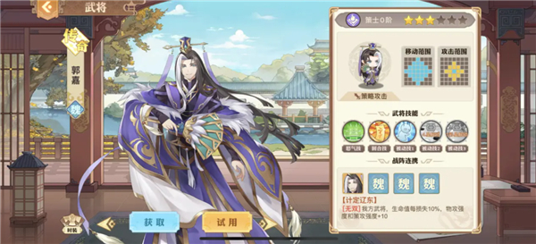 郭嘉在技能上兼顾了自身输出和增幅队友输出两方面,输出主要来自被动反击以及各种方式叠加的最终伤害,而伤害增幅的效果主要是因为战队连携“计定辽东”和大招“十胜天机”所附带的效果,只要我方武将,生命值每损失10%物攻就会+10。