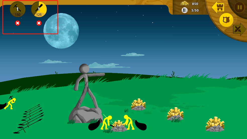 6、尽可能多的训练矿工和棍棒手,让他们抵抗敌军的攻击摧毁雕像b