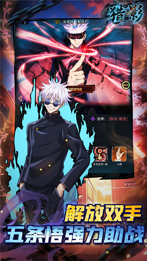 猎影是一款卡牌策略手游,根据动漫《咒术回战》改编而来,玩家将化身特级咒术师,从东京咒术高专启程,踏上十八桥秘境探索之旅。游戏高度还原动漫,虎杖、伏黑、钉崎等人气角色将依次登场,还集结咒术师、诅咒师、咒灵三大势力,玩家需要招募各角色组成咒术小队,参与激烈的忍术对决。猎影游戏还拥有咒术对决、跨服竞技等副本,玩家可与其他玩家在忍术舞台上一较高下。