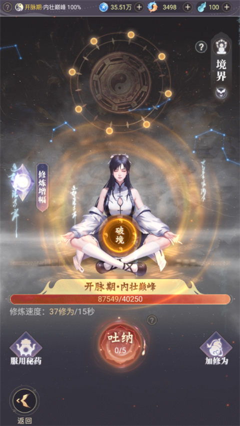 作为一款修仙游戏,境界培养是重中之重。在《大武道》中,玩家主要通过挂机修炼和炼制丹药获取经验,通过升级灵气池、培养功法和宝具等提升挂机修炼速度。