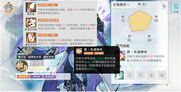 技能带灼烧,50%高级法术连击,后面可以转前排1号控制位置