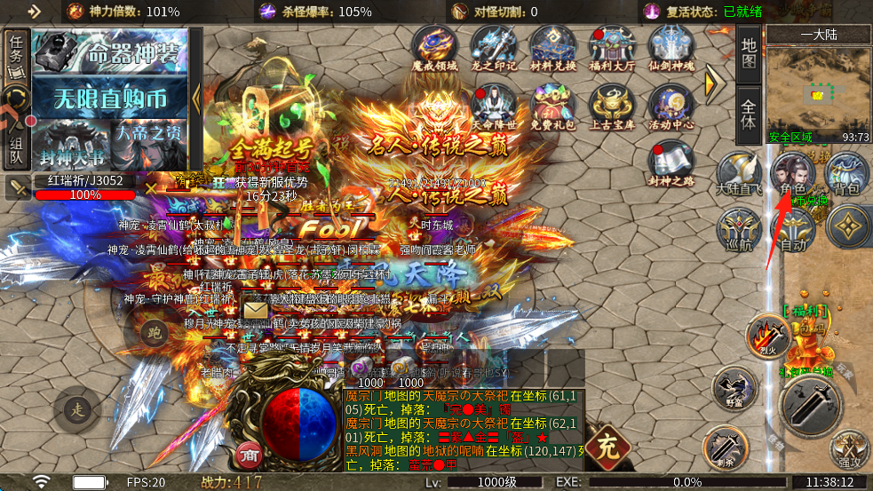 普通小怪直接掉落顶级装备(红光柱提示),散人玩家无需氪金即可逆袭,实现“打金自由”。