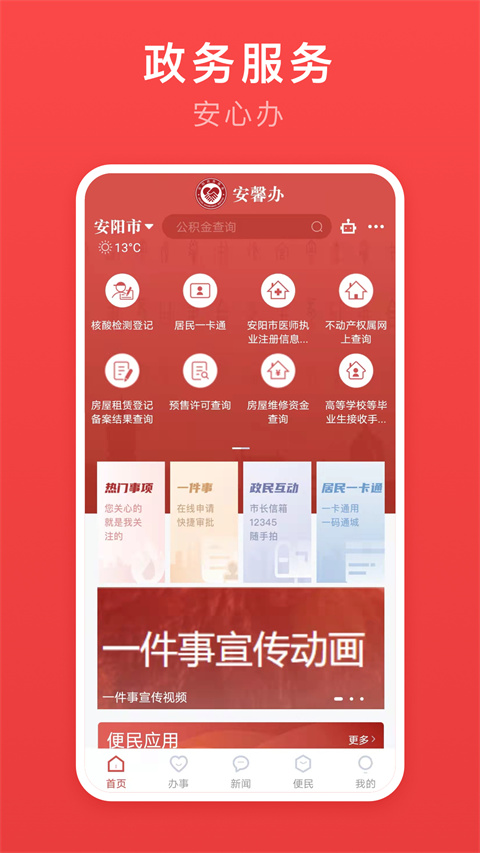 安馨办app是专为安阳本地人民所推出的一款手机政务服务软件,集“网上办事”、“政民互动”、“金融服务”于一体,能够一键查询市县两级政务服务事项办理流程、办理材料等办理进度,从而实现政民互动,让政府、企业和广大群众多方受益,让城市管理更智慧、政府运行更高效、群众生活更便捷。