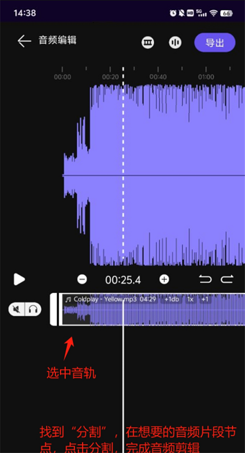 3、选中音轨,在想要的音频片段节点,点击分割后即可完成视频剪辑操作。