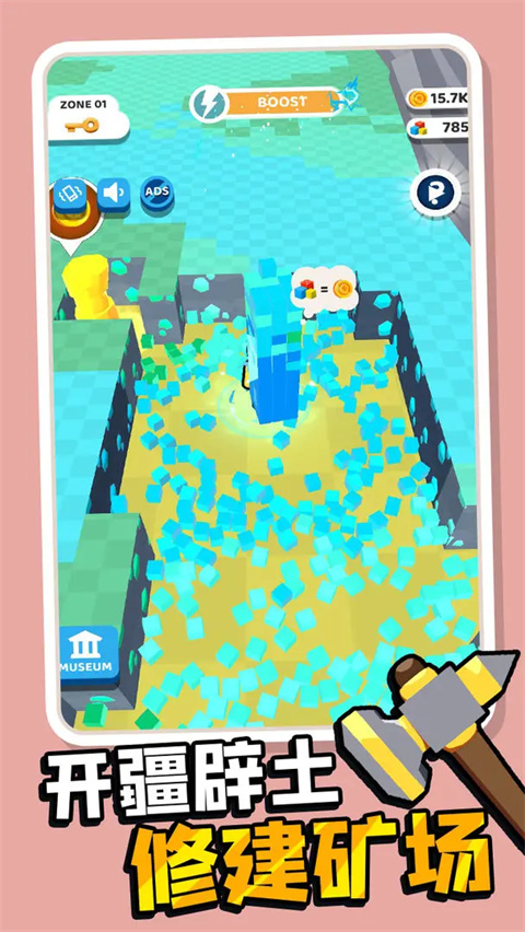 游戏的操作也很方便,用摇杆控制角色走动,靠近矿区就能自动挖矿。每次把当前区域的矿石都挖完后还能解锁新的区域,每个区域的矿物种类和收益都不一样,玩起来不会觉得单调。另外,游戏里的像素风格画风也让采矿的过程显得特别有趣,操作感很强。