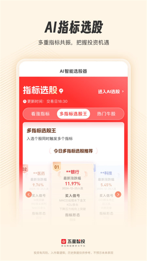 五星智投App是一款智能投资顾问服务平台应用,它基于自主研发的“新征程853”投研系统,融合金融科技与专业投研能力,为个人投资者提供智能化、定制化的股票分析与财富管理服务。五星智投App内的“先排雷,再选股”风控体系集成六维诊股评分、财务健康预警及异常交易监测工具,可实时推送个股风险系数与关键事件,有效降低投资踩雷概率!此外,五星智投App还依托AI智能顾问“星仔”,提供7×24小时个股解析、策略解读与市场追踪功能,致力于降低投资门槛,助您实现长期价值增长。