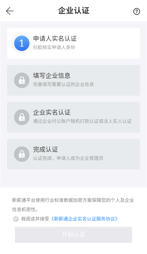 步骤一:完成实人认证后,如果是新企业未入驻平台,进入【我的-我的企业】,点击“新的企业”,进入下一个页面后,点击“新的企业”页面右上角的“+”号,进入“企业认证”页面。如对企业认证过程有疑问,可点击“企业认证”页面右上方小问号,里面汇总了常见问题及解答,仍有其他疑问可在线咨询桂建通客服。