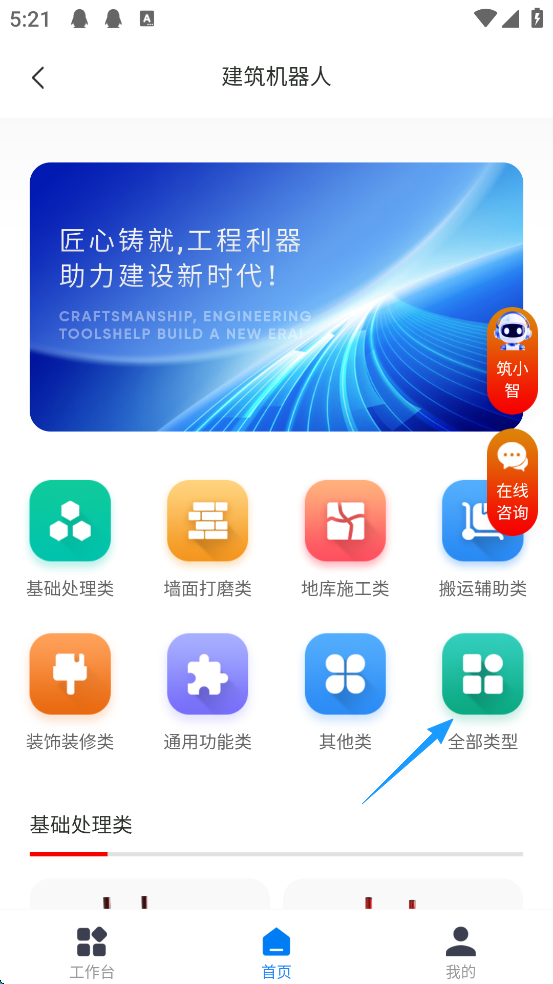 1、点击屏幕下方的“首页”。(以租赁博智林流动制砖车为例)