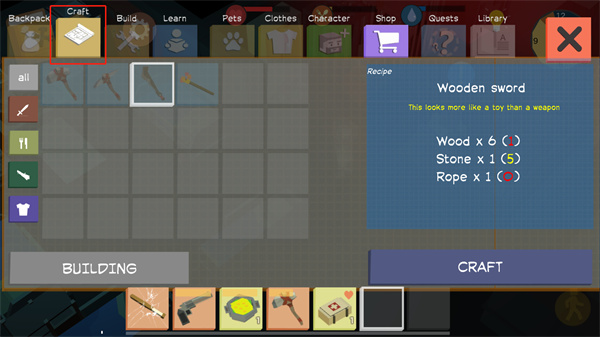 8、点击Craft来制作道具,制作道具需要收集材料才能进行制作;