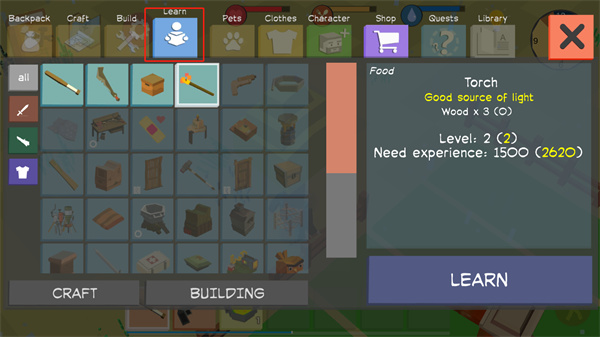 7、玩家可以点击Learn来学习一些高级道具的制作方法;