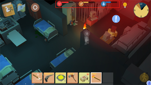 僵尸启示录和生存游戏上手简单,玩家需要通过滑动游戏左下角的区域来进行移动、点击游戏右下角的区域来进行进攻,当玩家移动到可以收取道具的附近,玩家可以点击游戏右边的手掌按钮进行收取,需要注意的是玩家在游玩的时候还需要注意游戏上方的血条、饱食度和水分,当饱食度和水分见底会消耗血条,血条见底则代表游戏结束。