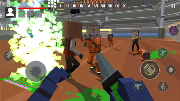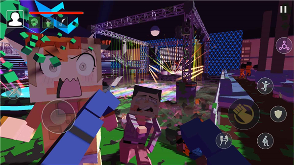 血染小镇手机版是一款采用第一人称的动作对战手游,你将成为一个方块人与其他人对战,刚进入游戏时手上是没有武器的,不过你可以向其他NPC挥拳发起攻击。当你攻击了某个NPC时其他NPC就会把你围起来向你发起进攻或者互殴,需要快速在场景内找到不同的道具为你所用,木棍、刀子或者木板,任何可以拾取的物品都能成为你的武器!