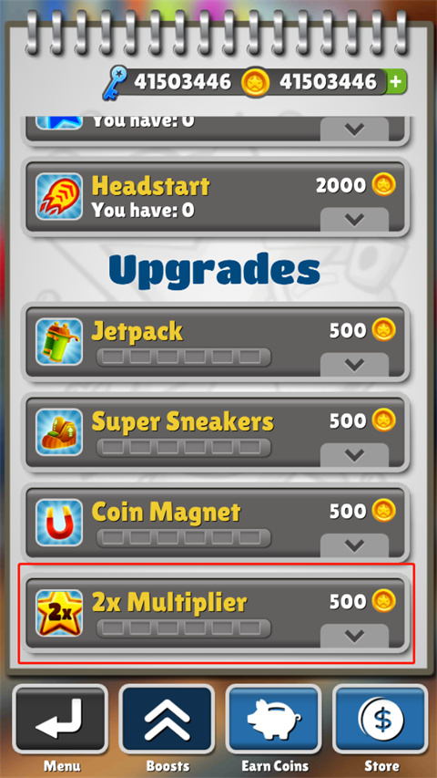 Boosts内的2X Multiplier!游戏中捡到的2X Multiplier道具也可以短时间内提升倍数。