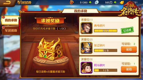 最容易被忽视的武将碎片获取来源,每天发出求助,其他军团成员进行援助即可直接领取武将碎片。