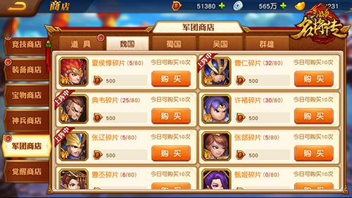 武将商店可以购买各阵营紫色以上品质武将碎片和完整武将卡片。